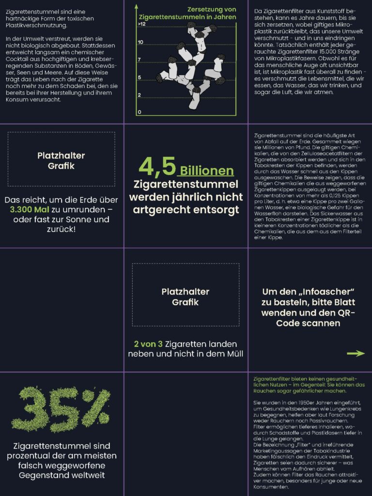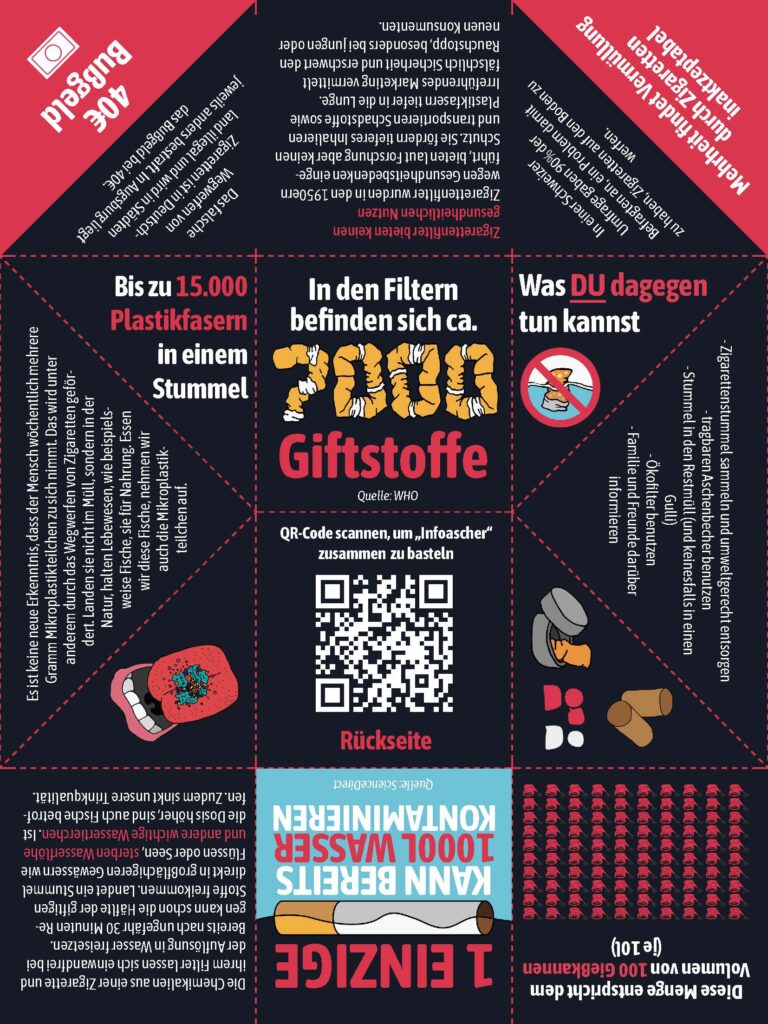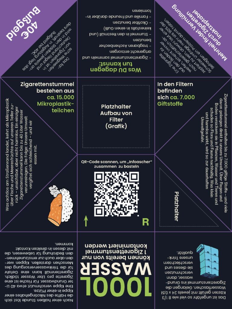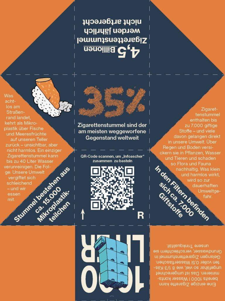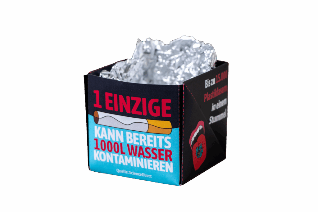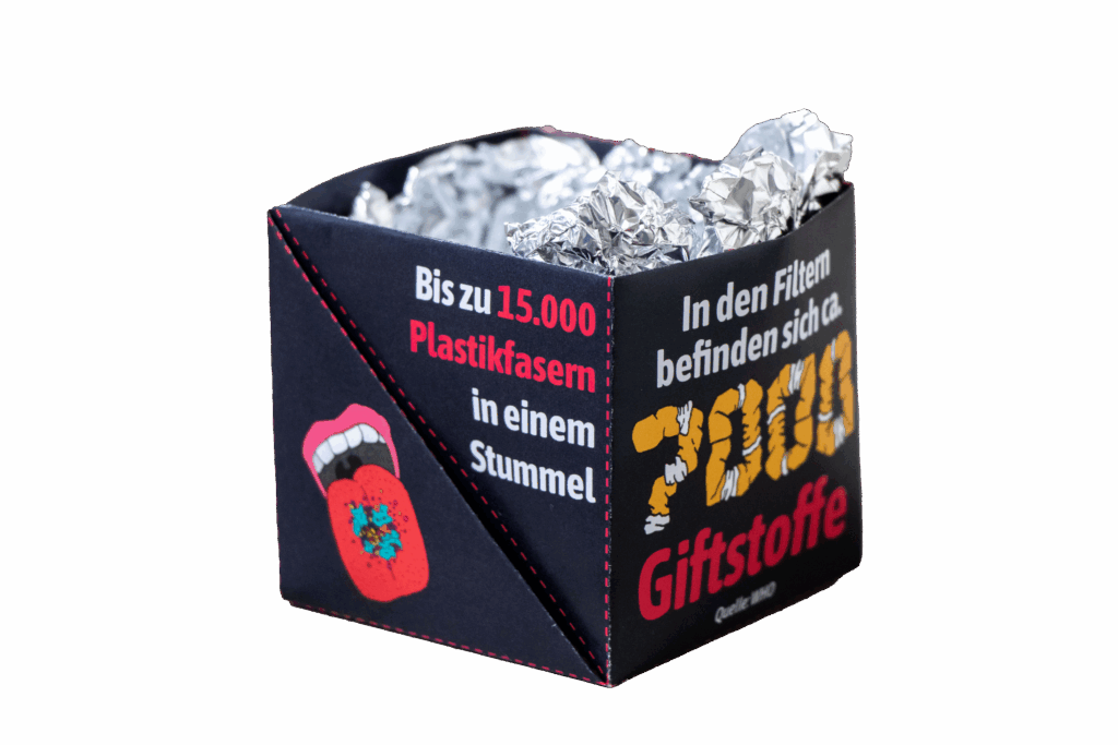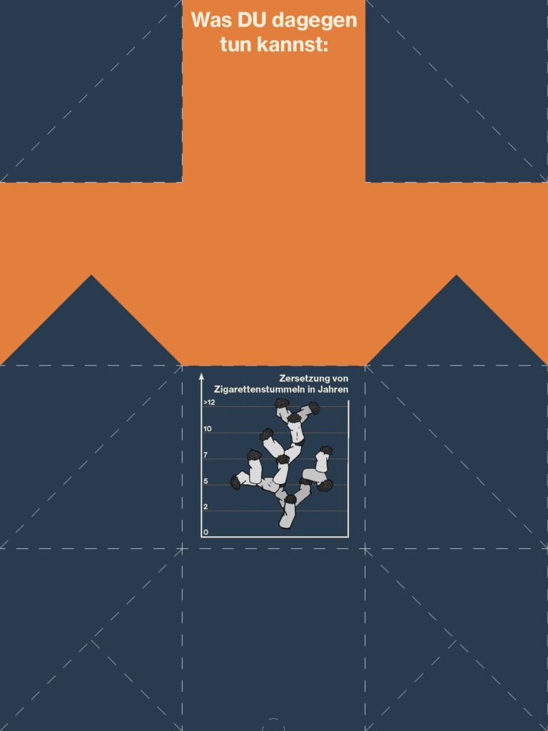 Der Fokus bei der Wahl meines Mediums lag darauf, einen potenziellen Lösungsweg für das Problem gleich mitzuliefern. Nach einiger Recherche kam ich auf die Idee, einen Flyer zu gestalten, der sich in einen Aschenbecher umfalten lassen könnte.