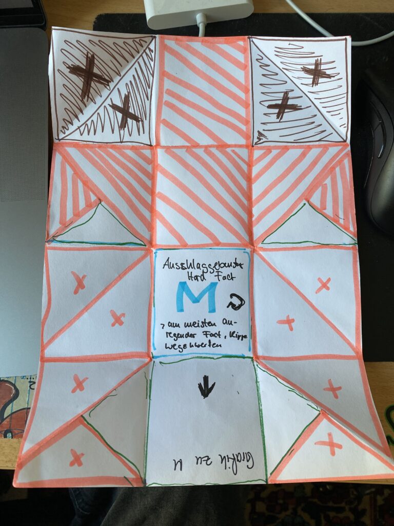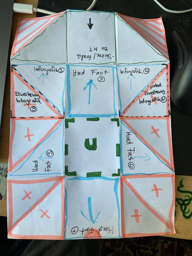 Den kompliziertesten Teil der Entstehung stellte das Layouten dar. Das Layout musste zweidimensional als auch dreidimensional funktionieren, wobei ich mich schlussendlich dazu entschied, dass die Rückseite vor allem dreidimensional funktionieren sollte. Denn diese besaß die meisten Flächen, die in zusammengebastelter Form noch bespielt werden konnten.